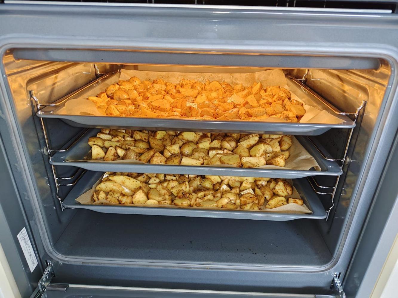 Gemeinsam wurden die Kartoffeln gewaschen, geschnitten, gewürzt und anschließend im Ofen knusprig gebacken. Schon bald zog ein herrlicher Duft durchs Schulhaus, und die Vorfreude auf das gemeinsame Essen war groß.