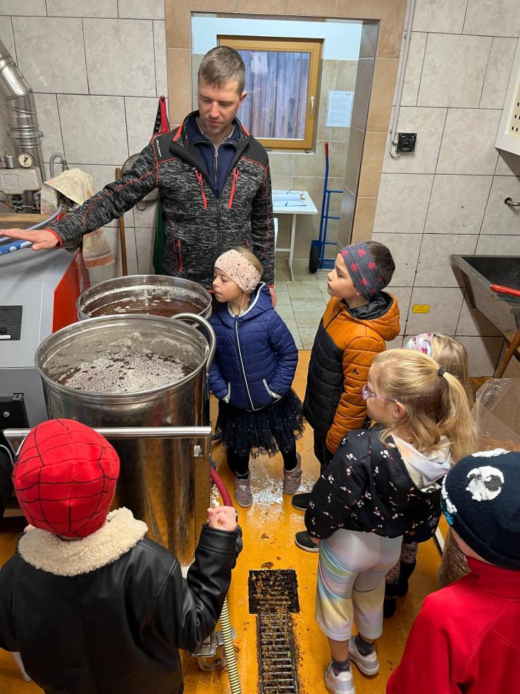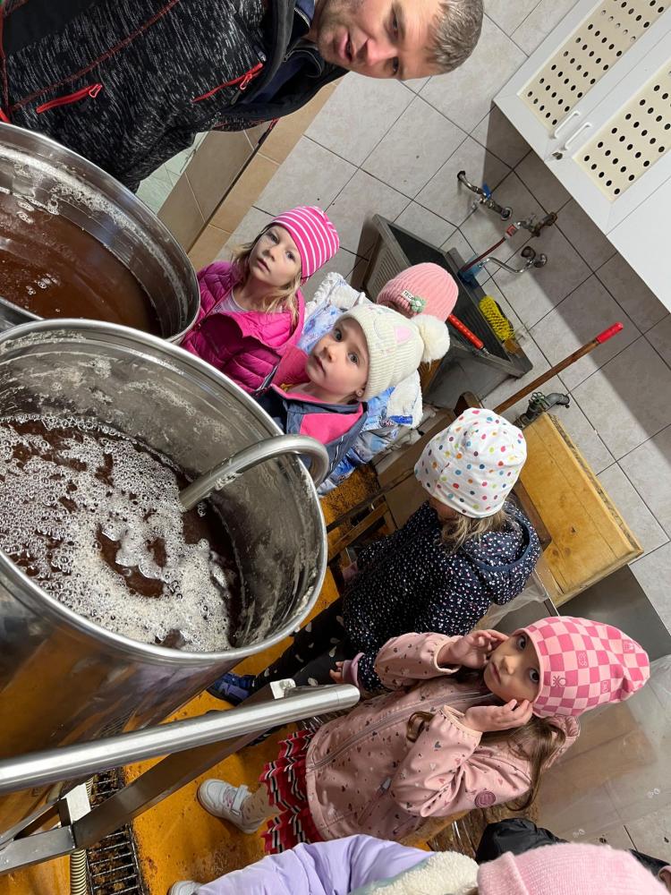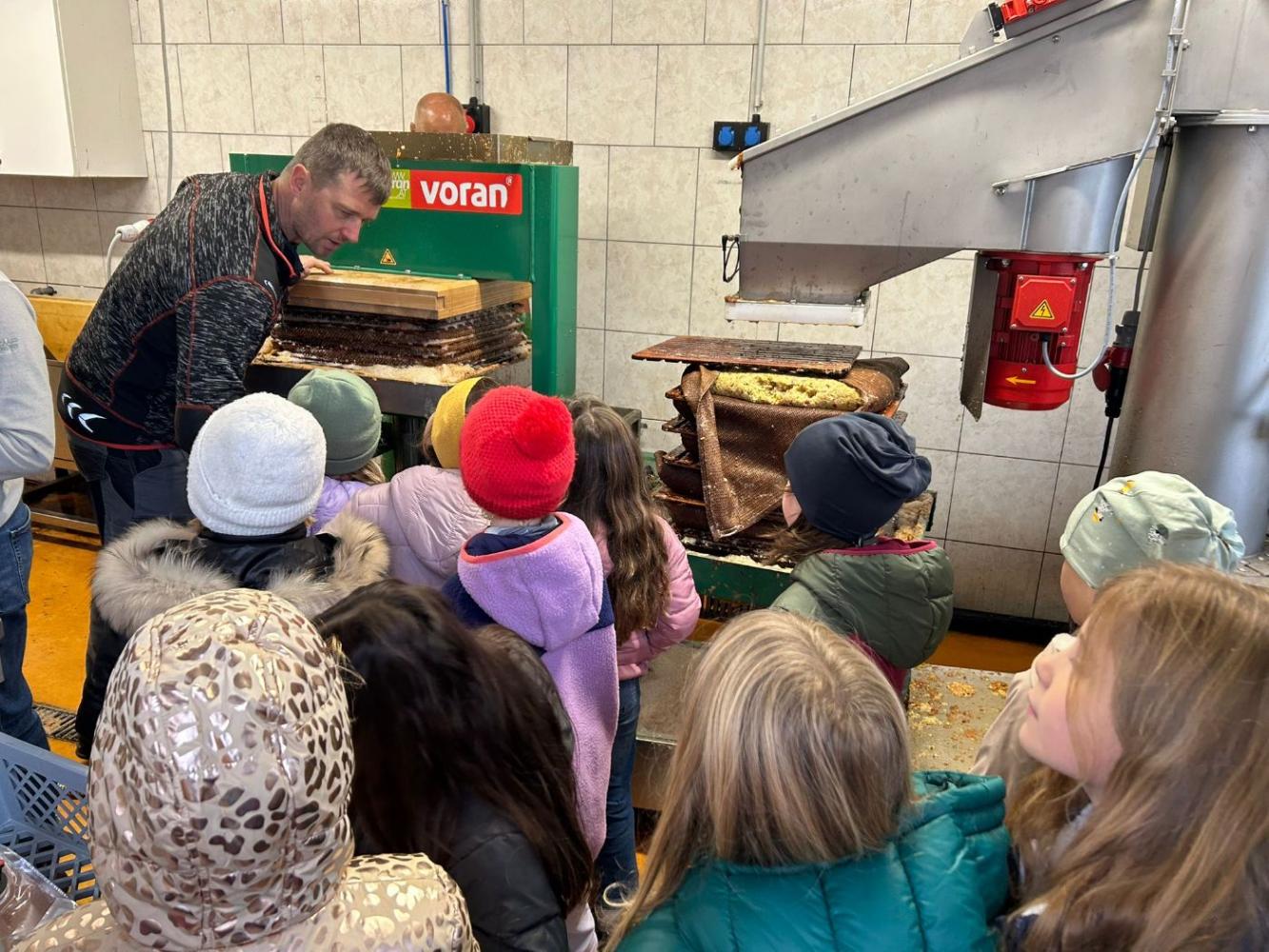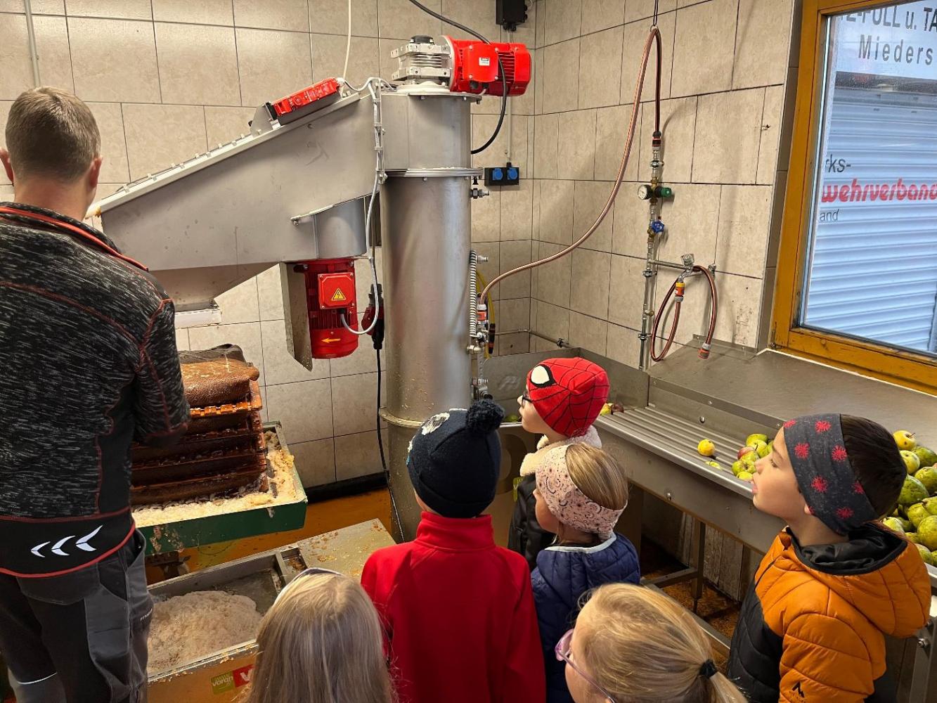 Am Freitag war es dann soweit: Die gesammelten Äpfel wurden zur Apfelsaftpressung gebracht! Die Kinder durften dabei zusehen, wie aus den knackigen Äpfeln Schritt für Schritt köstlicher Apfelsaft entstand – vom Zerkleinern bis hin zum Pressen. Besonders spannend war es, den frischen Saft aus der Presse laufen zu sehen.