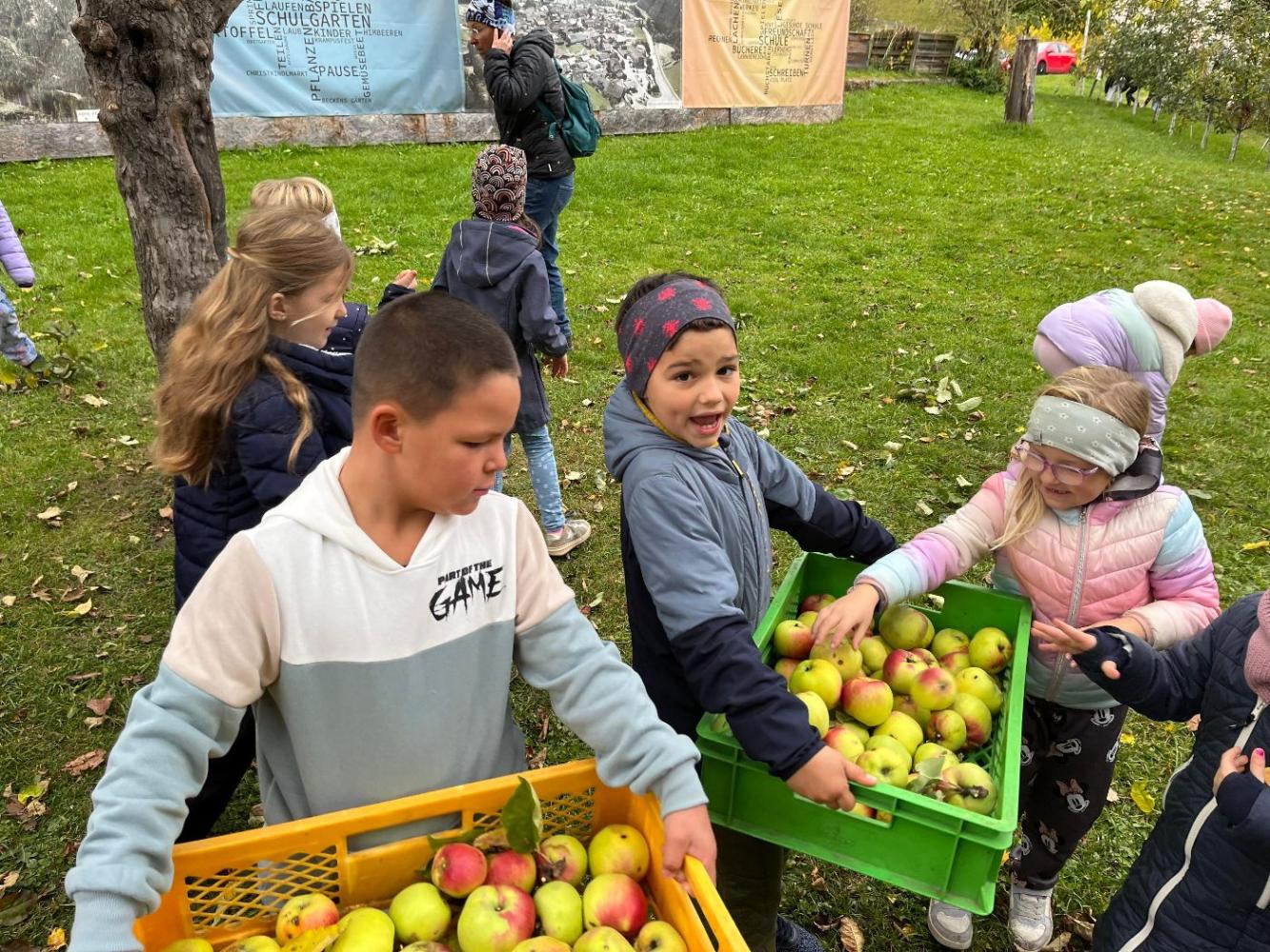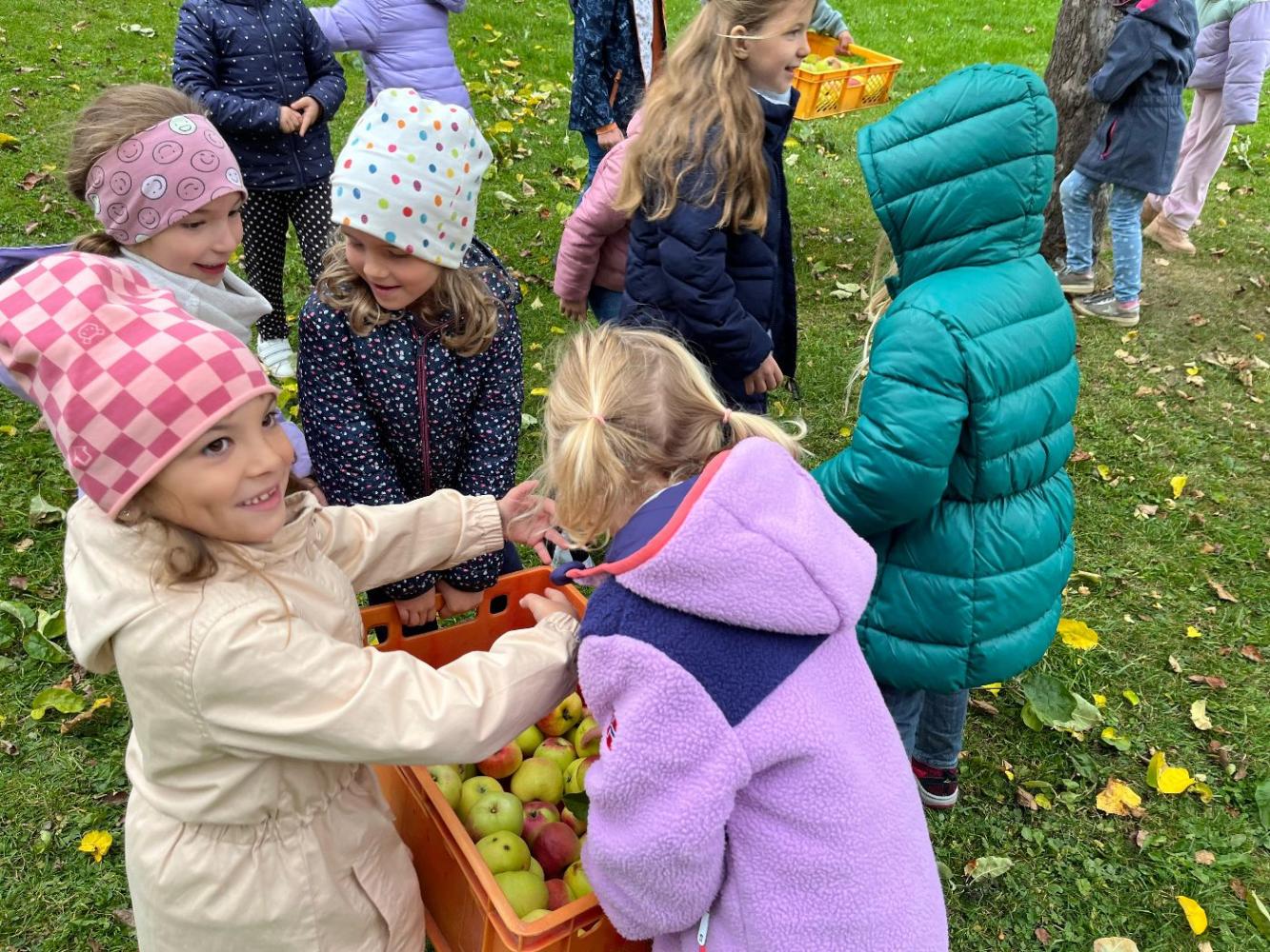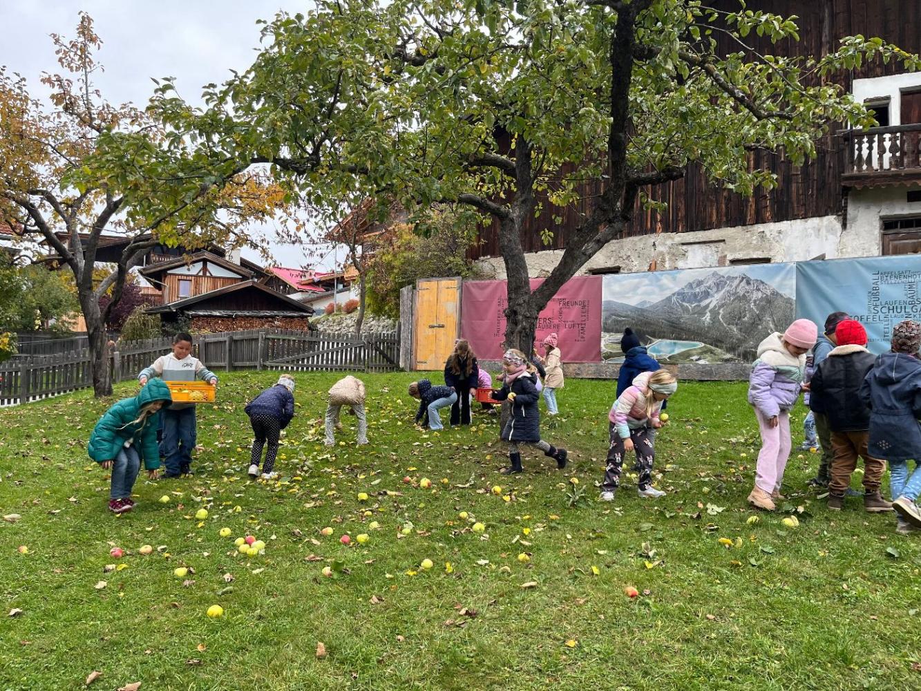 Am Mittwoch dieser Woche machten sich die ersten Klassen der Volksschule Mieders auf den Weg in den Schulgarten, um die reifen Äpfel zu ernten. Mit großer Begeisterung sammelten die Kinder die bunten Früchte ein – es wurde eifrig gesucht, entdeckt und in Körbe gelegt.